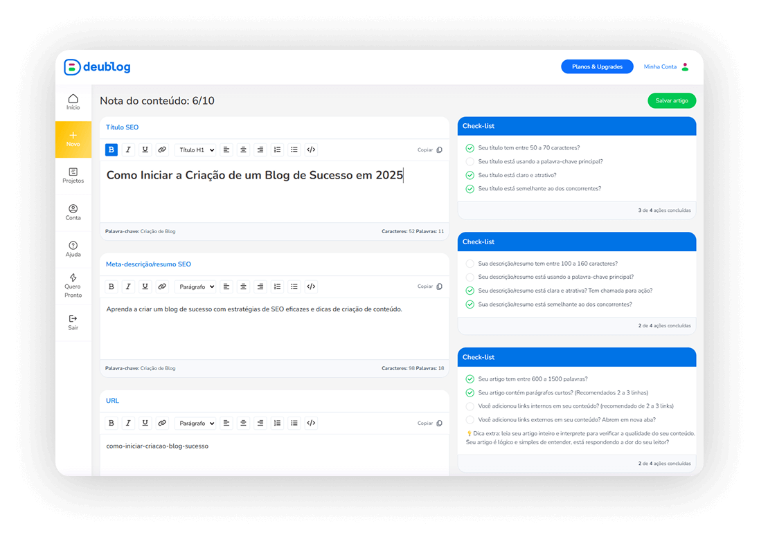 O Deu Blog é uma plataforma SaaS que utiliza inteligência artificial para gerar artigos de blog otimizados para SEO — de forma simples, prática e eficiente.